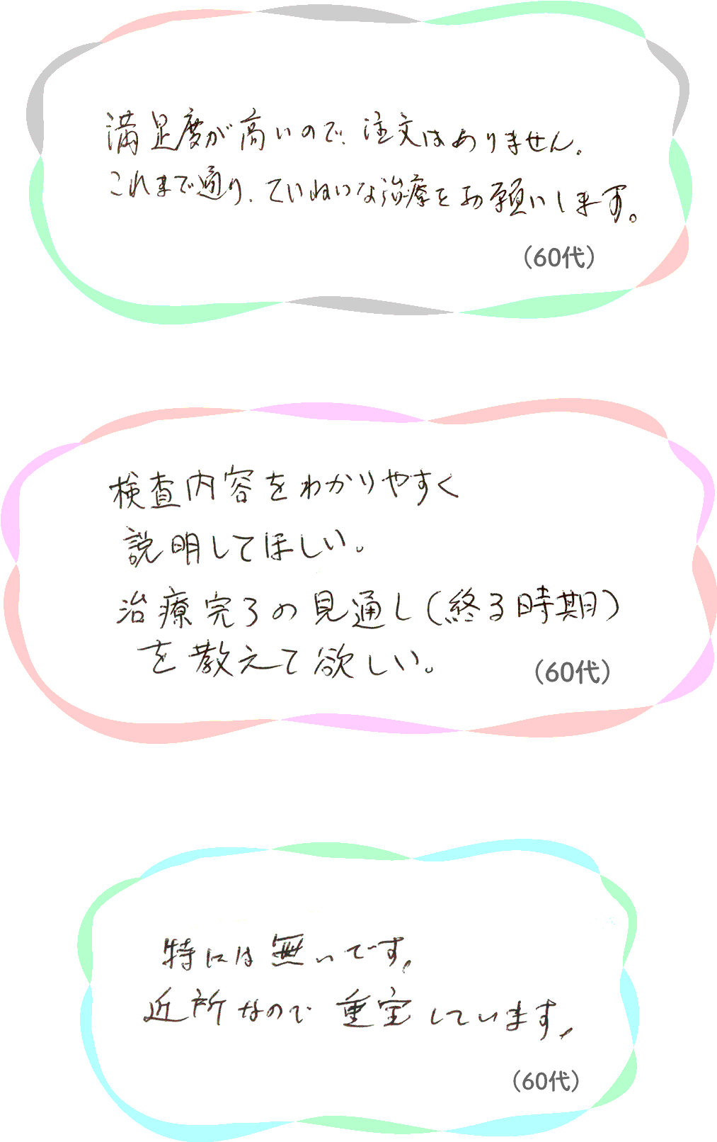 評価いただきありがとうございます。患者様のご意見を参考に、検査内容の充実、ならびに治療の見通しの説明に尽力いたします。