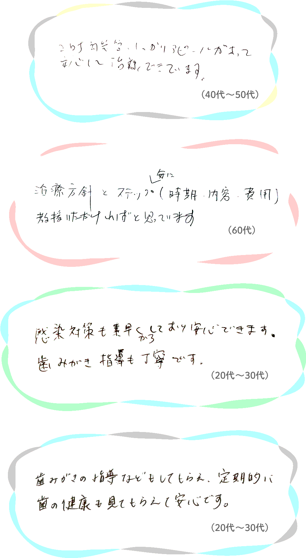 感染対策を評価いただきありがとうございます。治療方針と内容費用がより一層わかりやすい説明を心がけて参ります。